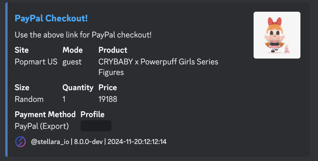 * Sends you a [Discord webhook](https://guides.stellaraio.com/stellar/navigating-stellaraio/what-is-the-settings-tab/how-to-set-up-discord-notifications) message when your task carts so you can try to manually checkout. This may spam your webhook channel and might be unstable. Keep in mind the 5 minute cart hold
