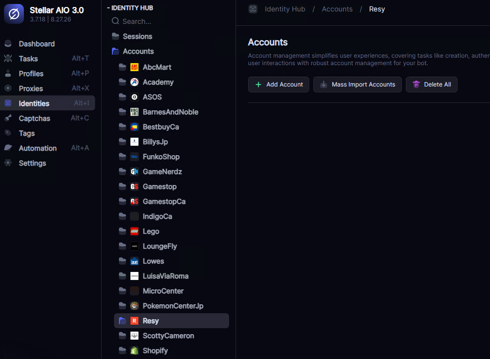 1. In bot, navigate to **Identities** tab > **Accounts** > Click on **Resy**