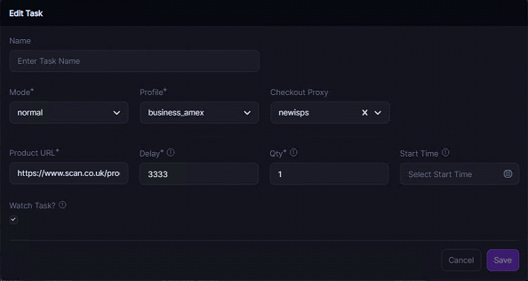 If you leave the **Watch Task** checkbox **unchecked**, the checkout task will act independently. It will monitor the SKU itself, add the item to your cart, and checkout directly